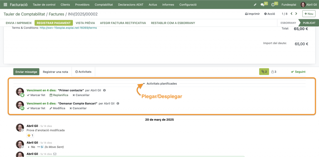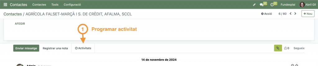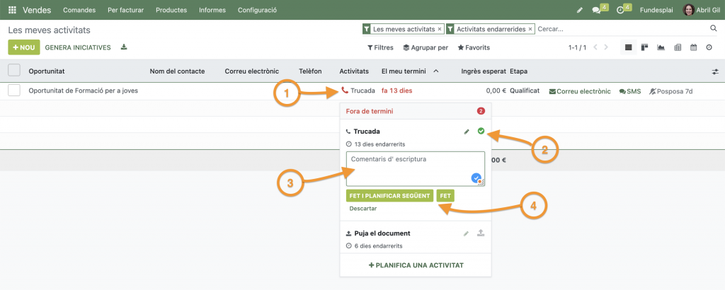 - Programar activitats a fer per part teva o de qualsevol altre membre de la teva organització i registrar comentaris sobre el desenvolupament de l’activitat.