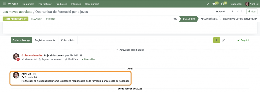 - Planificació: afegeix l’activitat al Chatter sota activitats planificades.