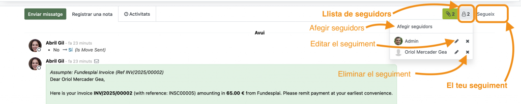 En funció del model en el qual et trobis, CreaERP pot assignar seguidors de forma automàtica a les fitxes de contingut. En general, el creador d’una fitxa sempre es converteix en seguidor. També pot passar per exemple que, quan es creï un pressupost per a un client, si aquest té un comercial assignat, aquest es converteixi en seguidor del pressupost l’ha creat un altre usuari de forma automàtica.