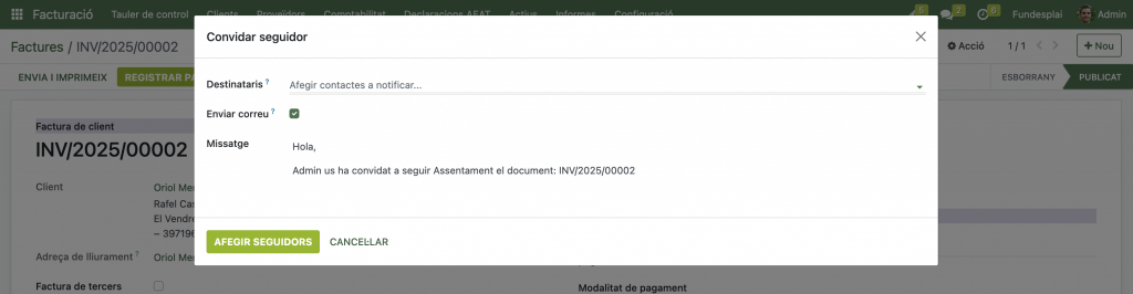 - Convidar a nous seguidors. Opcionalment pots enviar un correu personalitzat per a convidar a un o diversos usuaris.