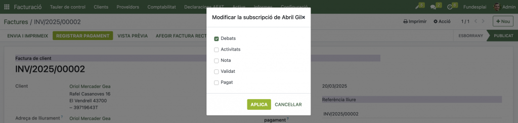 - Modificar quin tipus de notificacions rebran (clica a sobre del llapis) En general, el seguiment per defecte és rebre les notificacions dels ‘Debats’ que significar rebre els missatges, però es poden activar també notificacions sobre les activitats o les notes. En funció del model, pots trobar altres esdeveniments sobre els quals es poden activar notificacions. Per exemple, la validació o el pagament d’una factura.