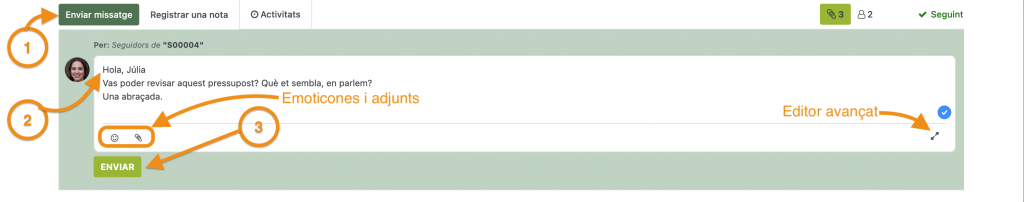 Pots adjuntar fitxers i incloure emoticones. Si necessites un editor de text complet o vols utilitzar plantilles de missatges, pots obrir l’editor avançat. (Anar a plantilles de correu)