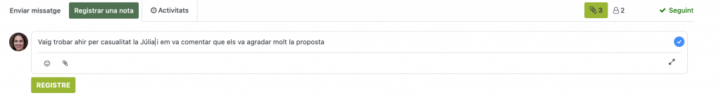 Si vols registrar una anotació interna per a recordar algun detall que pugui ser d’interès per a tu mateix o la teva organització pots Registrar una nota. El funcionament és exactament el mateix que Enviar un missatge amb la diferència que no s’enviarà cap notificació (excepte si algun seguidor ha activat aquesta opció en la seva subscripció) i simplement quedarà constància al Chatter.