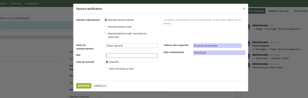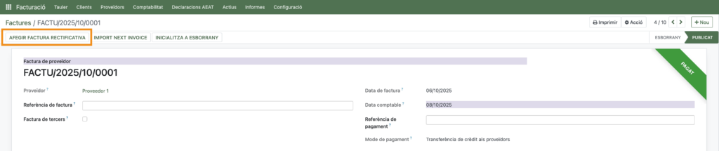 Quan un proveïdor rectifica una factura anterior ja registrada, cal que registris aquesta factura rectificativa. El procediment per a fer-ho és similar al ja explicat per a les factures de client.