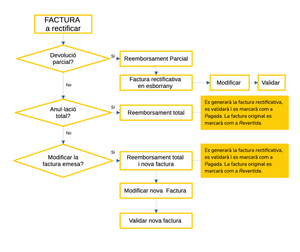 I seguir els mateixos procediments explicats a les factures de client en funció del tipus de factura: reemborsament parcial, total o total amb una nova factura.